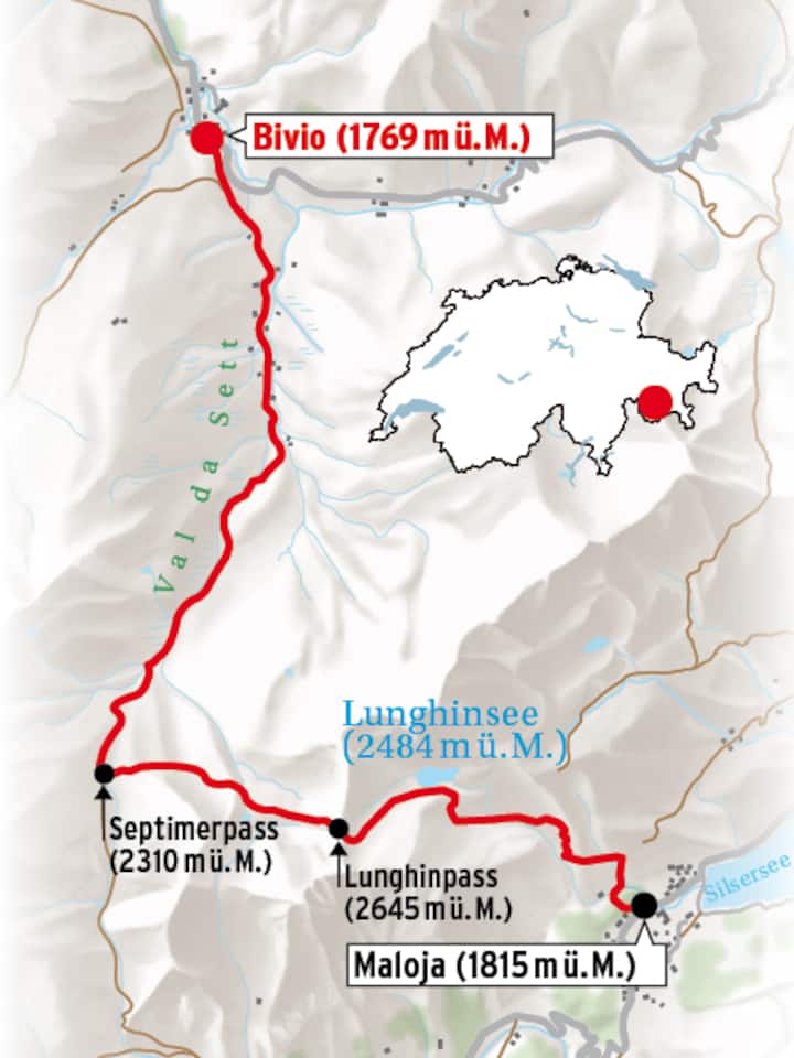 Wanderroute: Ab Maloja führt ein steiler Weg über Plan di Zoch hinauf zum Lunghinsee. Von dort aus geht es flacher zum Lunghinpass mit der Dreiwasserscheide. Abstieg zuerst steil, dann angenehm abfallend zum Septimerpass und weiter durchs Val da Sett hinunter nach Bivio. Total 840 Höhenmeter Aufstieg und 875 Meter Abstieg – eine mittelschwere Wanderung.