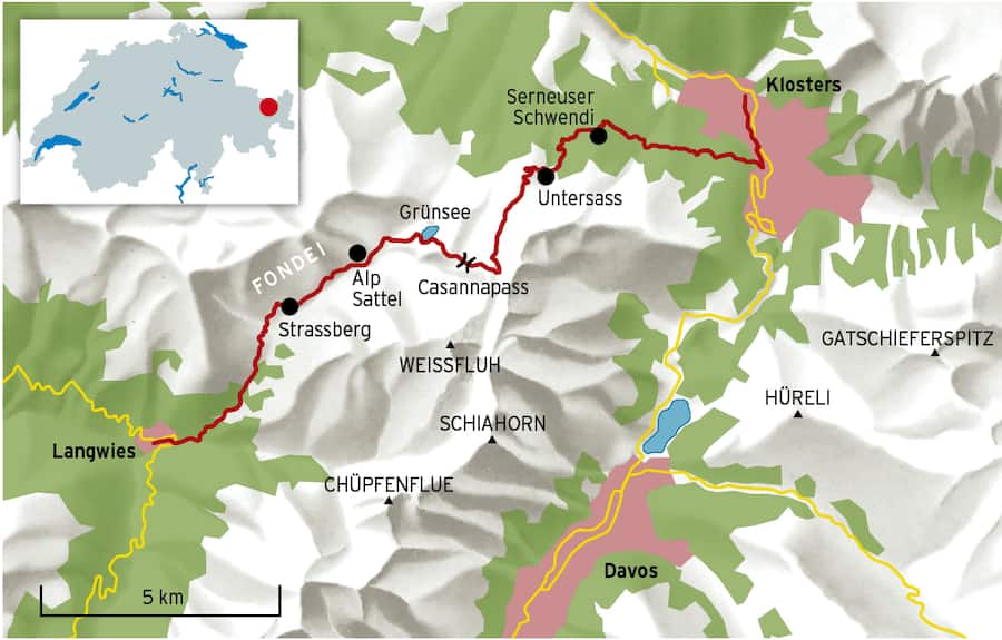 Die Distanz von Langwies (1377 m ü. M.) über den Casannapass (2233 m ü. M.) nach Klosters (1191 m ü. M.) beträgt 18 Kilometer. In etwa 6,5 Stunden überwinden Wanderer knapp 1000 Höhenmeter.