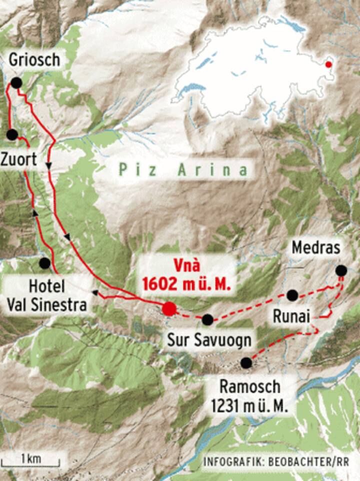 Am Anfang steht eine nahrhafte Wanderung vom schmucken Dorf Vnà aus durchs Val Sinestra. Die Route führt über Wiesen und durch Wald zum früheren Kurhaus Sinestra, einst berühmt für seine Arsensäurequellen. Von dort schlängelt sich der Weg stetig auf 1850 Meter Höhe hinauf zum Wendepunkt auf der Alp Griosch. Dazwischen das spektakuläre Highlight: die beiden Hängebrücken von Zuort – Schwindelfreiheit empfohlen!