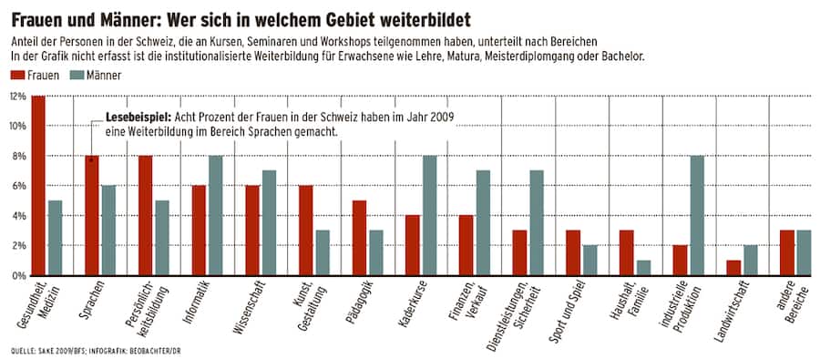 Die Grenze zwischen berufsorientierter und allgemeiner Weiterbildung ist nicht leicht zu ziehen. Auch die Definition für Weiterbildung ist unscharf: Offiziell ist mit Weiterbildung nur die nicht-formale Bildung in Kursen, Seminaren oder Privatunterricht und das informelle Lernen, etwa mit Hilfe von Fachliteratur, gemeint. Realitätsnäher ist der Begriff «Lebenslanges Lernen», den Bildungsexperten benutzen und in dem die Erwachsenenbildung und die Weiterbildung zusammengefasst sind. Die sogenannt formale Bildung umfasst die obligatorische Schule, die berufliche Grundbildung oder allgemein bildende Schulen und die Tertiärstufe (höhere Berufsbildung, Hochschulabschlüsse). Was die nicht-formale Bildung betrifft, waren 2009 die Themen Gesundheit und Medizin, Sprachen, Informatik und Persönlichkeitsbildung am gefragtesten (siehe Grafik).