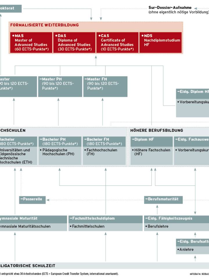 Trotz Chaos und hohen Kosten lassen sich Schweizerinnen und Schweizer nicht von Weiterbildungsplänen abhalten. Schon in der Primarschule haben ihnen die Lehrer eingeimpft, dass Bildung in einem Land ohne Rohstoffe das wichtigste Gut ist. Das Motto vom lebenslangen Lernen hat sich in den Köpfen festgesetzt. Der internationale Wettbewerb verstärkt das zusätzlich: Wer beruflich weiterkommen will, muss zeigen, dass er flexibel, offen und leistungsbereit ist und sich permanent weiterbildet.