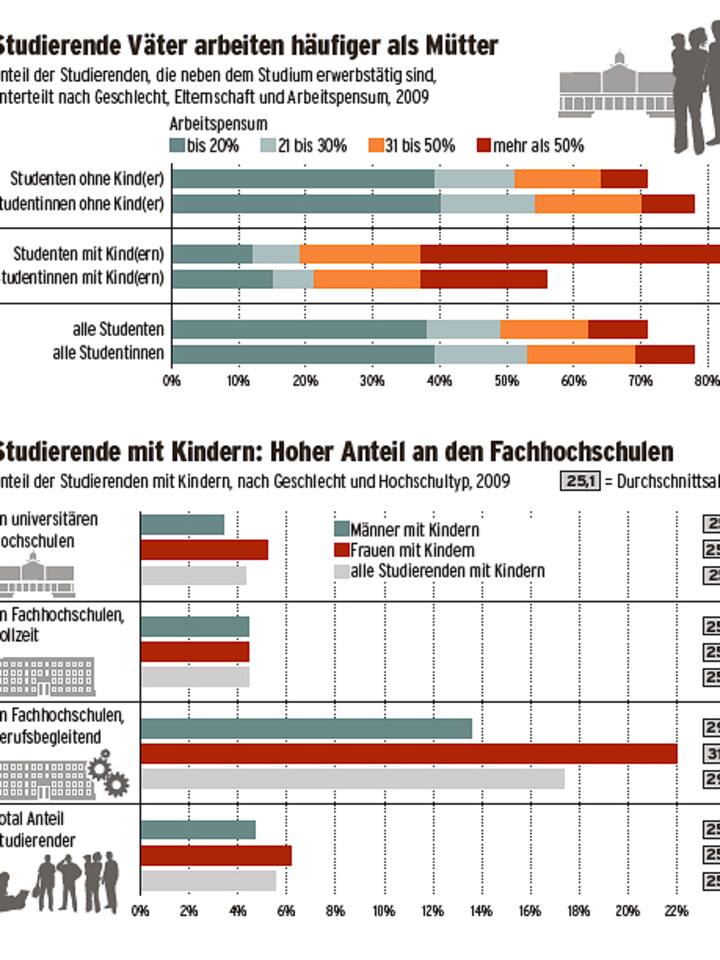 Am meisten belastet sind studierende Eltern; zwei Drittel von ihnen arbeiten neben Hochschule und Kinderbetreuung. Anna Birkenmeier, Mutter von zwei Mädchen, von denen eines während des Studiums geboren wurde, sagt: «Ich hatte Glück, dass ich eine flexibilisierte Ausbildung fand.» Die 29-jährige Journalismus-Studentin schloss mit dem Diplom der höheren Fachschule ab, nach vier statt drei Jahren, und beginnt nun einen zweiten Diplomlehrgang.