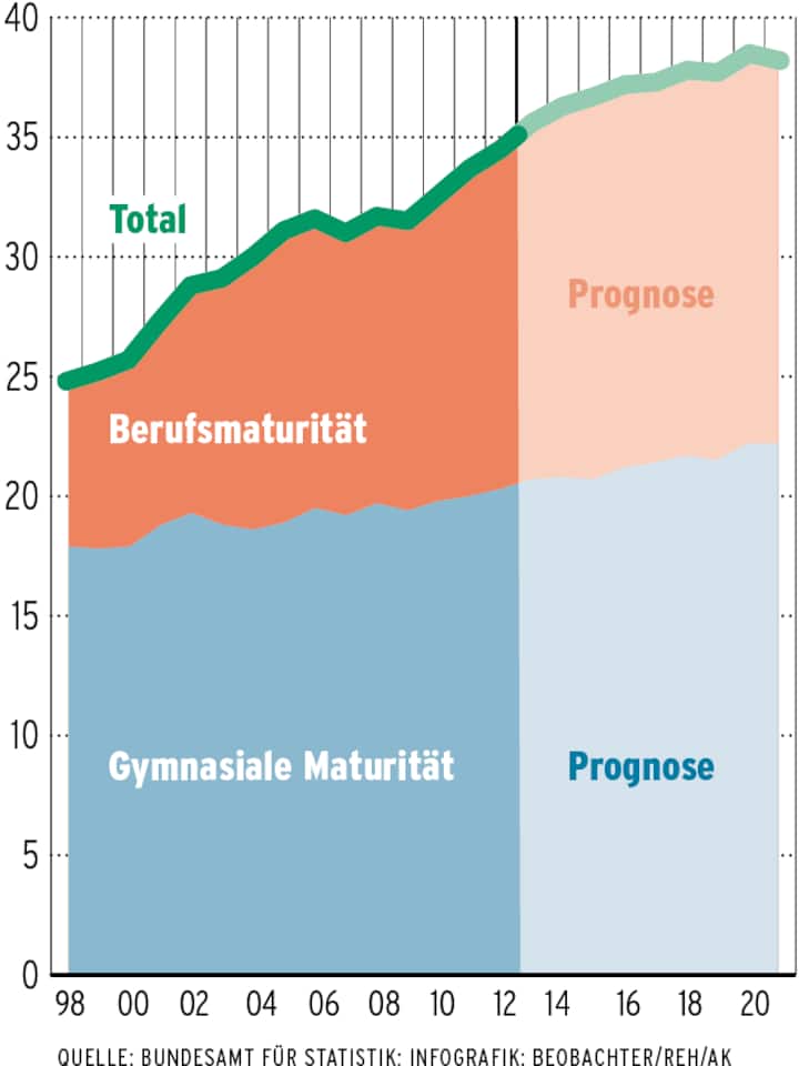 Zusammen mit den Berufsmaturanden ergibt sich eine Maturitätsquote von knapp 35 Prozent – was immer noch deutlich unter dem Durchschnitt der 34 OECD-Staaten liegt. 60 Prozent ist dort der Massstab. Die Frage, ob die schweizerische Quote zu tief oder gerade richtig liegt, spaltet die Bildungsfachleute. Diejenigen, die mehr Akademiker befürworten, argumentieren, dies sei notwendig, um in der Wissensgesellschaft bestehen zu können. Wer für den Status quo plädiert, findet die aktuelle Wettbewerbssituation gerade richtig, um auf Ebene Hochschulen eine Verwässerung des Akademikerstatus zu vermeiden.