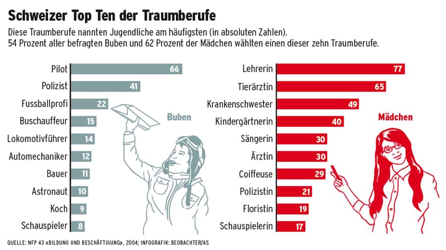 Gewählt werden Traumberufe mehrheitlich nach Geschlecht. «Das liegt vor allem daran, dass Pubertät und Berufswahl zeitlich zusammenfallen», erklärt der Solothurner Psychologe Markus Neuenschwander. «Mit 15 steht man mitten in der Suche nach der eigenen Geschlechtsidentität und will sich abgrenzen. Die frühe Wahl fördert damit traditionell geschlechtstypische Berufe.» So waren denn einige heutige Top-Ten-Berufe bereits 1970 beliebt. Andere wie Fussballprofi oder Schauspielerin fehlten allerdings – geändert hat sich zudem, dass Mädchen heutzutage auch akademische Berufe wählen.