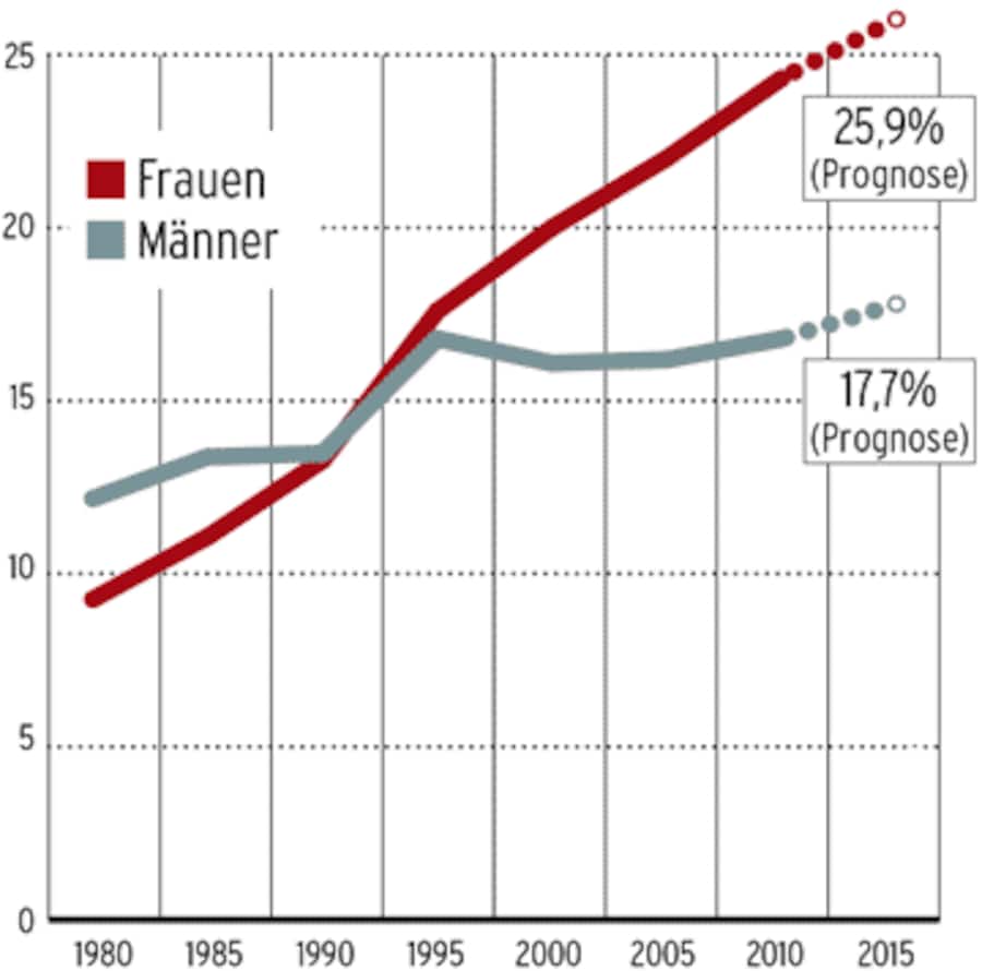 Im Kindergarten gibt es Männer überhaupt erst seit wenigen Jahren. Ihr Anteil dümpelt im tiefen einstelligen Prozentbereich. Mittlerweile stellen Lehrerinnen aber auch eine Mehrheit in den Klassenzimmern (siehe Grafik).