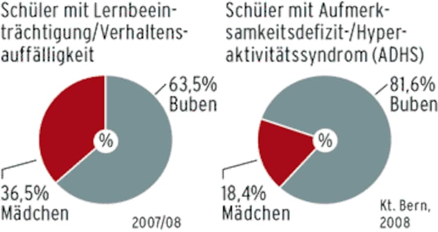 Die Zahlen sprechen eine andere Sprache. 2008 waren in der Schweiz 60 Prozent der Maturanden weiblich, obwohl der Anteil junger Männer und Frauen in der Bevölkerung ausgeglichen ist. In Genf und Bern ist das Missverhältnis noch etwas ausgeprägter. Während die Mädchen an den Gymnasien auftrumpfen, stellen Jungs in Klassen für verhaltensauffällige Kinder die Mehrheit. Zwei von drei Sonderschülern sind männlich. Buben repetieren öfter und werden häufiger aus der Schule ausgeschlossen. Sind Buben einfach dümmer? Oder sind unsere Schulen nicht für sie gemacht?