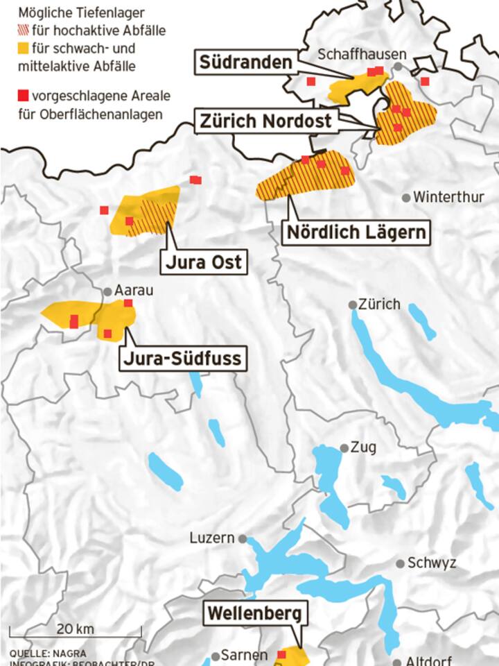 Sechs Regionen mit tonreichem Untergrund (siehe Grafik) sind derzeit als mögliche Standorte für die Endlagerung schwach- und mittelaktiver Abfälle in Prüfung. Nur drei davon könnten sich dank Opalinustonschichten auch für die Lagerung hochaktiver Abfälle eignen. Bis 2016 will die Nagra, eine Genossenschaft von AKW-Betreibern und Bund, je zwei Standorte für die beiden Abfallkategorien auswählen. Dazu werden in den kommenden Jahren vertiefte geologische Untersuchungen durchgeführt. Parallel dazu hat die Nagra im Januar 20 mögliche Standorte für die Aussenanlagen vorgeschlagen. 2019 könnte der Bundesrat die Rahmenbewilligung für den Bau eines Tiefenlagers erteilen. Erst danach wird das Volk an der Urne befragt werden. Die betroffenen Gemeinden haben allerdings kein Vetorecht.
