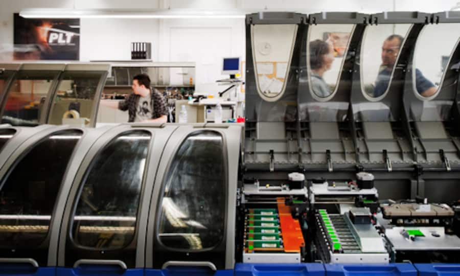 Eine Apparatur als Alleskönner: Diese Maschine bedruckt Plastik, markiert mittels Laser und prägt.