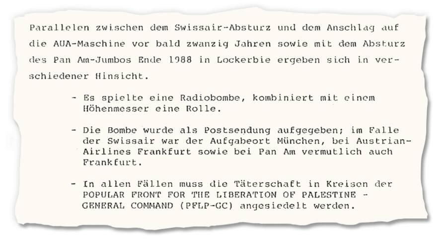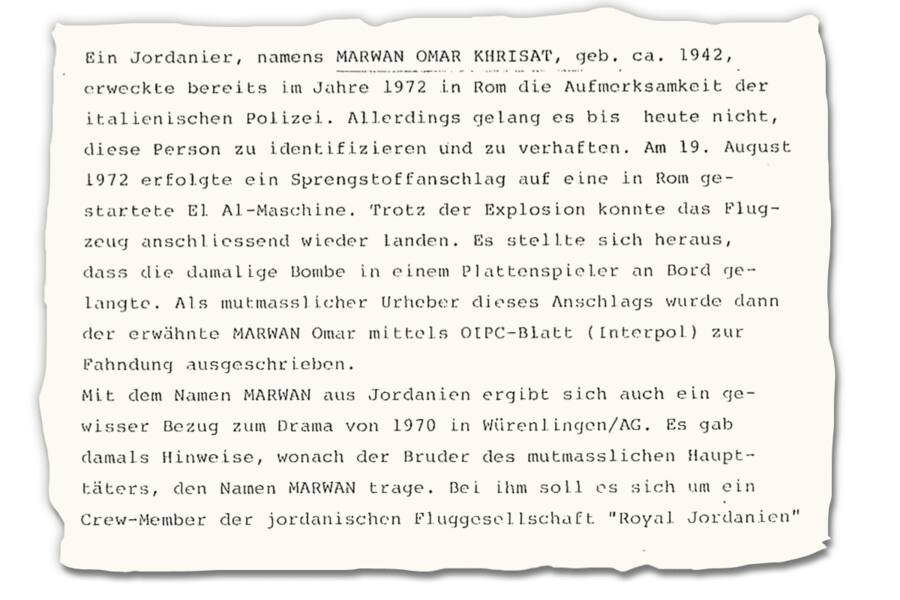 Aus diesem Dokument wird klar: Die Schotten gingen davon aus, dass ein als Bombenspezialist bekannter palästinensischer Extremist namens Marwan Abdel Razzak Khreesat wohl auch beim Bombenanschlag auf die Swissair eine Schlüsselrolle gespielt hatte. Der heute 67-jährige Jordanier war jahrelang Weggefährte des gewaltbereiten Palästinenserführers Achmed Jibril, eines Kontrahenten von Jassir Arafat. Er lebt heute angeblich in Jordaniens Hauptstadt Amman.