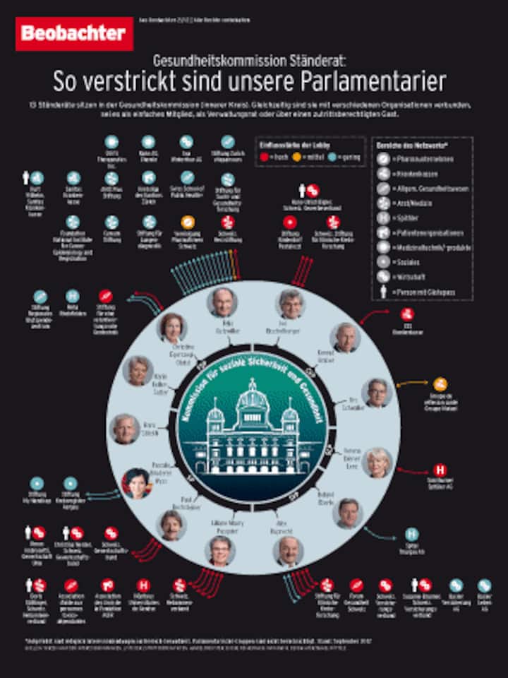 Der Beobachter hat die Interessenbindungen der Mitglieder von National- und Ständerat am Beispiel der Kommission für soziale Sicherheit und Gesundheit analysiert – für einmal nicht nach der Anzahl Mandate, sondern nach der Art der Mandate. Damit wird zum ersten Mal deutlich, welche Firmen, Verbände und Organisationen in qualitativer Hinsicht am meisten Einfluss auf das Parlament ausüben (siehe obenstehende Grafiken).