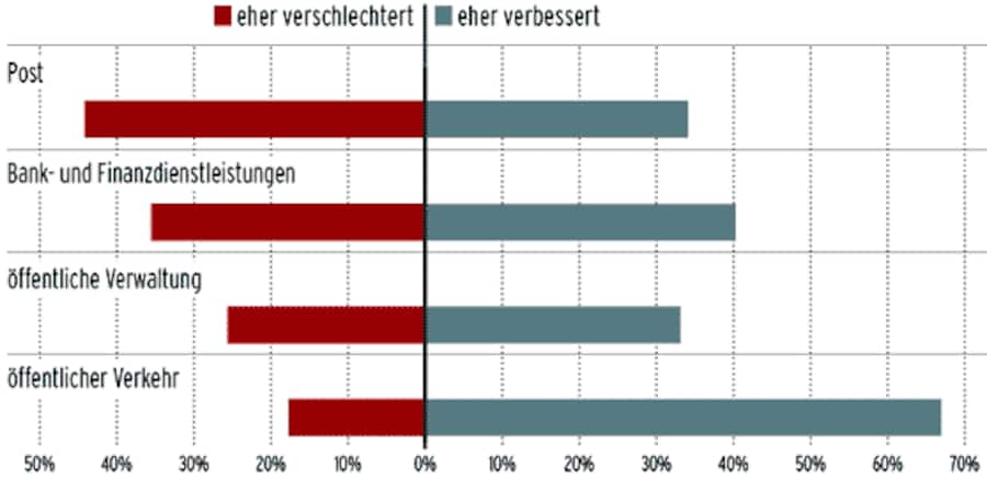 Frage: In welchen Bereichen haben sich die Dienstleistungen in den letzten Jahren eher verschlechtert und in welchen Bereichen eher verbessert?
