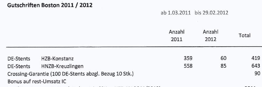 Dokumente, die dem Beobachter vorliegen, zeigen, wie das Geschäft funktioniert: Boston Scientific lieferte etwa zwischen März 2011 und Februar 2012 insgesamt 1152 DE-Stents an die beiden Kliniken. Nach Abzug der Rabatte – 20 Prozent für Konstanz, 10 Prozent für Kreuzlingen – resultierte ein durchschnittlicher Einkaufspreis von 604 Franken pro Stent.