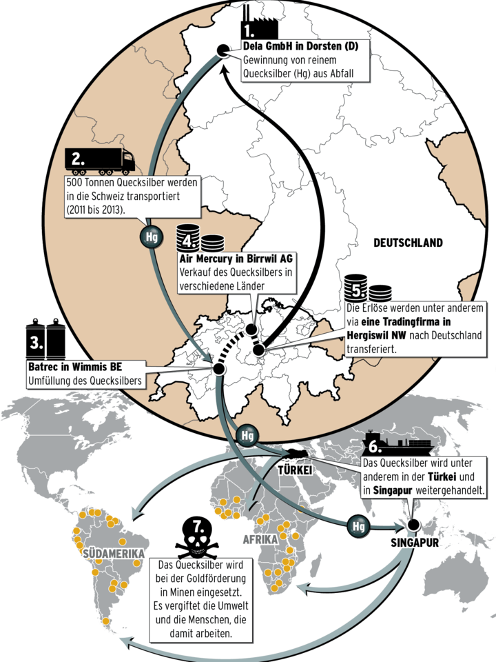 So wurden 500 Tonnen deutsches Quecksilber trotz Exportverbot in die Schweiz geschafft. Da in der Schweiz der Quecksilberhandel legal ist, war es somit «gewaschen» – und wurde für Millionen weiterverkauft.