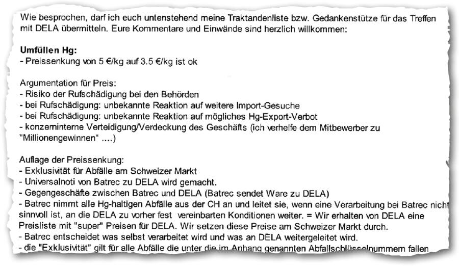 Der Dela schlug Offenthaler «Gegengeschäfte» vor: «Batrec nimmt alle Hg-haltigen Abfälle aus der CH an und leitet sie [...] zu vorher fest vereinbarten Konditionen weiter.» Die Batrec setze für die Dela zudem «‹super› Preise» am Schweizer Markt durch: ein deutlicher Hinweis auf – verbotene – Preisabsprachen, kommentierte ein Experte, dem der Beobachter die E-Mail vorlegte.