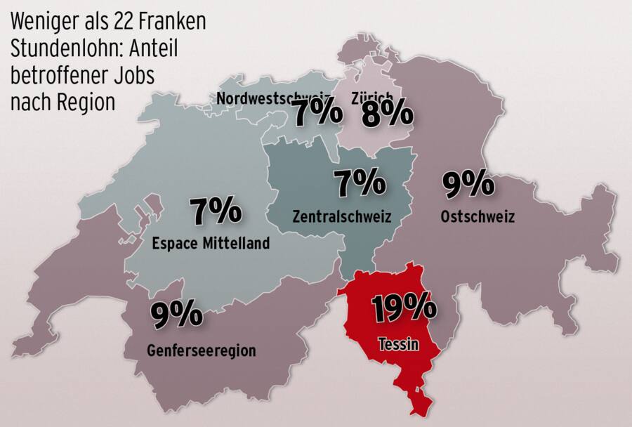 Rund 9 Prozent der Arbeitnehmer verdienten 2010 weniger als 22 Franken pro Stunde. Betroffen sind 330 000 Beschäftigte. Als Tieflöhne gelten Einkommen von weniger als zwei Dritteln des Durchschnittslohns. Das sind 3986 Franken brutto bei 40 Wochenstunden. Im internationalen Vergleich weist die Schweiz relativ wenige Tieflohnstellen aus. Nur Belgien, Finnland und Portugal haben weniger Tieflohnbezüger.