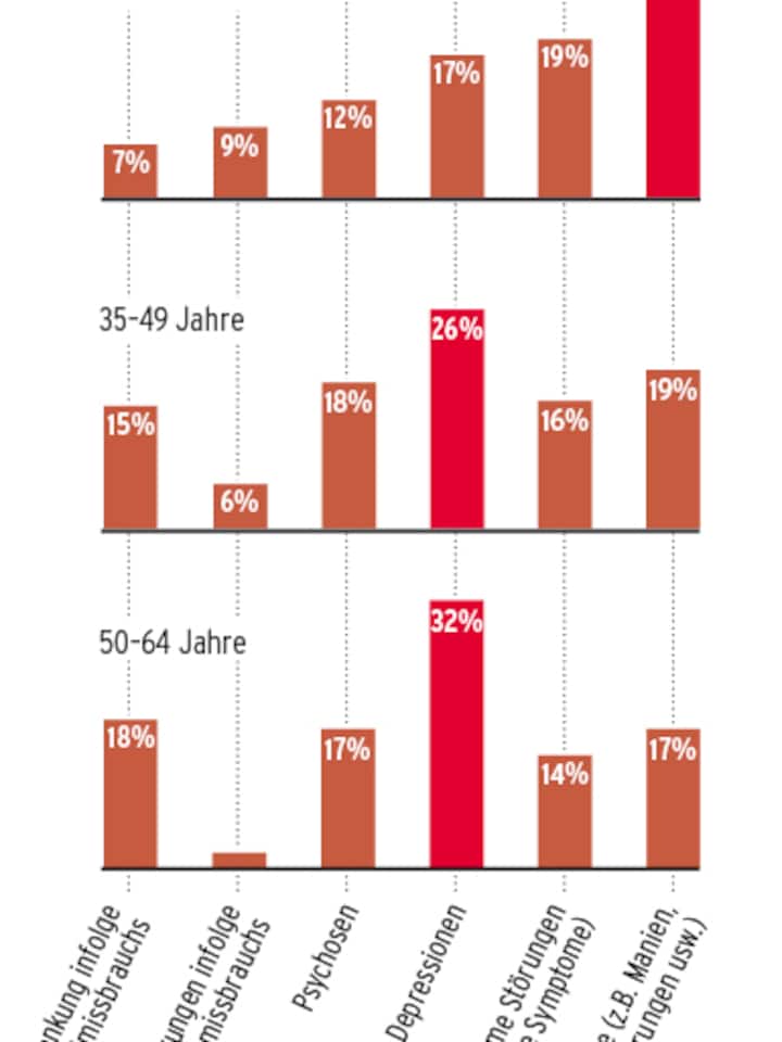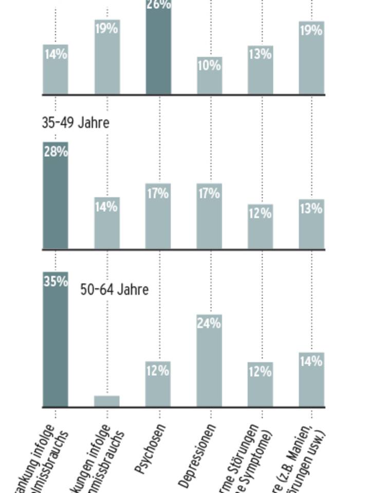 Häufigste Diagnosen für psychische Erkrankungen und Verhaltensstörungen, unterteilt nach Geschlecht und Alter, 2008, in Prozent