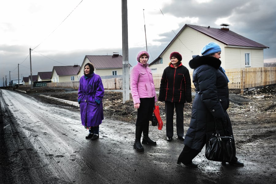 Venera Gaynetdinovas neues Daheim steht am Ende einer Strasse aus zäher, schwarzer Erde und grobem Schotter, an der alle Häuser gleich aussehen. Wie auch in der nächsten und übernächsten Strasse, wie überall in Novomusljumovo: gelb angestrichene Einheitskisten mit rotem Dach, drei Zimmern, Küche und Badezimmer. 200 solche Häuser haben die «Produktionsorganisation Majak» und die Regionalregierung hingestellt, 300 sollen es am Schluss sein. Im Prospekt, den man über das neue Dorf hat drucken lassen, sieht man zufriedene Menschen vor schmucken Häusern und lachende Kinder, die einen Gemüsegarten anlegen. Der Kontrast zur Tristesse der Wirklichkeit könnte nicht grösser sein.