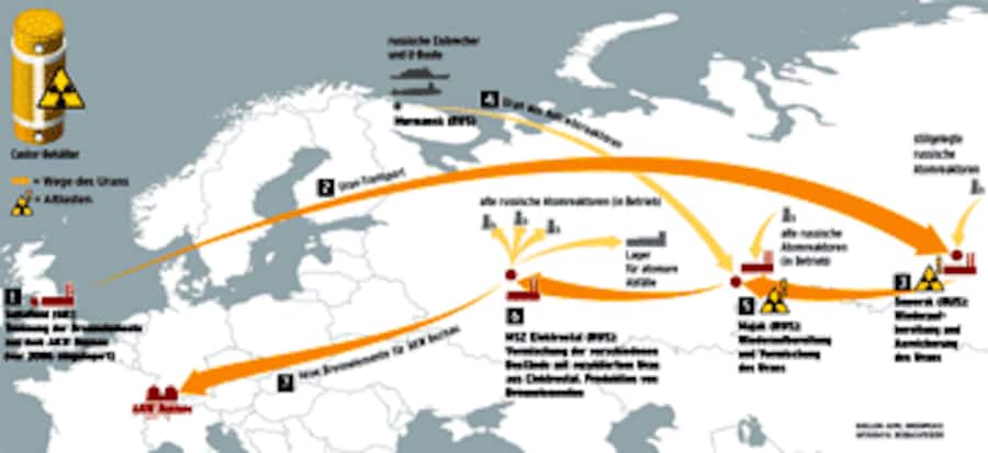 Die Wege des Urans von der Schweiz über England und Russland zurück sind verschlungen. Da Uran in zivilen Anlagen nur bis maximal fünf Prozent angereichert werden darf, braucht es zusätzlich höher angereichertes Uran aus militärischen Quellen, um neue Brennelemente produzieren zu können. Die Darstellung bezieht sich auf einen Vertrag des AKW Beznau mit dem französischen Brennstofflieferanten Areva. Der Vertrag läuft Ende 2010 aus.