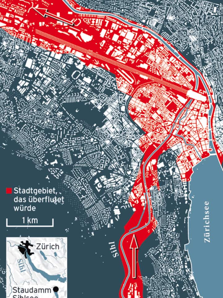 Zwar liegt der Sihlsee 40 Kilometer von Zürich entfernt und ist im Vergleich zum Zürichsee winzig. Trotzdem stellt er für die Grossstadt ein nicht zu vernachlässigendes Risiko dar. Die 1937 fertiggestellte Staumauer des Sihlsees ist 33 Meter hoch. Würde sie brechen, flössen die Wassermassen durch das Sihltal in Richtung Zürich. Bei einer vollständigen Zerstörung des Staudamms würden weite Teile der Stadt bis zu acht Meter unter Wasser gesetzt (rote Bereiche auf der Karte). Die Häuser würden unterspült; viele würden ganz einstürzen. Immerhin könnten sich wohl die meisten Menschen retten: Die Flutwelle würde die Stadt erst 1 Stunde und 25 Minuten nach dem Dammbruch erreichen. Mit dem Wasseralarm könnte die Bevölkerung rechtzeitig informiert werden. Damit es nicht zum Notfall kommt, wird die Staumauer regelmässig überwacht.