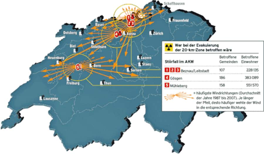 Alle Schweizer AKW liegen in besiedeltem Gebiet. Bei einem atomaren GAU müssten bis zu einer halben Million Menschen evakuiert werden; von einer allfälligen Strahlenwolke wäre aber das ganze Mittelland betroffen. Die Karte zeigt die Windrichtungen, die an den AKW-Standorten vorherrschen.