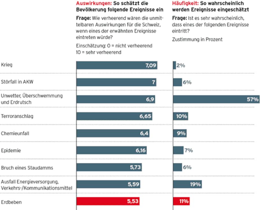Die Angaben der Gebäudeversicherungen geben zu denken: Bei über 70 Prozent der Gebäude in der Schweiz wurden keine besonderen Massnahmen zur Erdbebensicherheit getroffen. Lediglich 10 Prozent sind nach modernen Erkenntnissen erdbebensicher. Nur für Gebäude wie Spitäler oder Schulen, in denen sich viele Menschen aufhalten, gelten besondere Vorschriften.