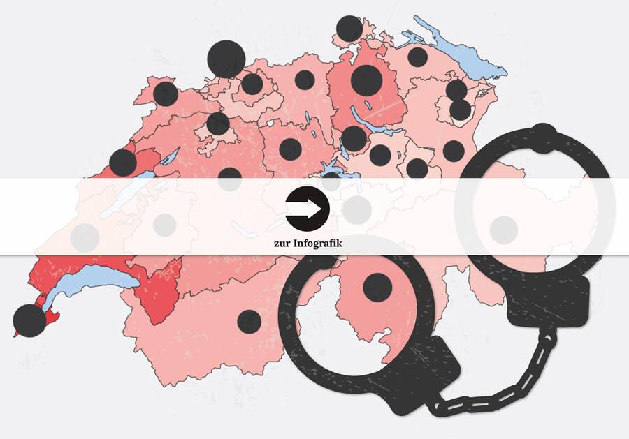 Finden Sie mit einem Klick auf die Infografik heraus, in welchem Kanton am meisten Straftaten begangen werden und wie hoch die Polizeipräsenz in den Kantonen ist.