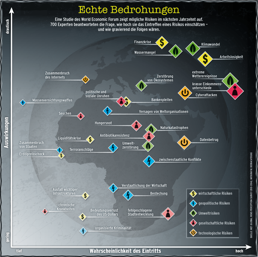 Unruhen aufgrund längerer Stromausfälle, Finanzkrisen und Cyberattacken sind auch für die Sicherheitsexperten des Schweizer Rückversicherers Swiss Re realistische Szenarien. Und den jährlich am World Economic Forum (WEF) erstellten «Global Risks Report» führt 2014 eine mögliche weitere Finanzkrise an. Weiter sieht die Wirtschaftselite die wachsenden sozialen Unterschiede als Gefahr und ebenso das Knapperwerden der Ressource Wasser (siehe Grafik).