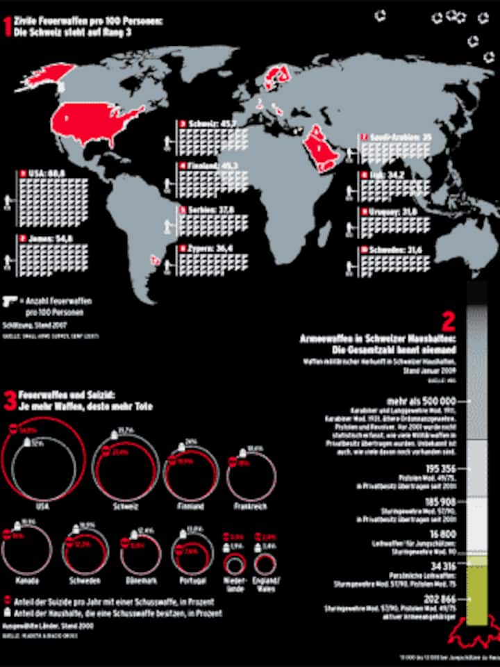 Tatsächlich ist das Land bis an die Zähne gerüstet. Die jährlich vom Institut de Hautes Etudes Internationales et du Développement in Genf publizierte Erhebung «Small Arms Survey» weist 2007 für die Schweiz, über alles geschätzt, 2,3 bis 4,5 Millionen Feuerwaffen aus. Dies ergibt 46 Schusswaffen pro 100 Personen. Damit steht die Schweiz auf Platz drei der Weltrangliste, nach den USA und Jemen und weit vor Krisengebieten wie Irak, Palästina oder Sierra Leone.
