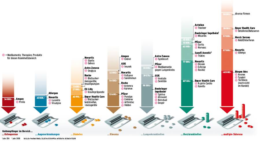 Die Beobachter-Analyse zeigt aber vor allem eines: Geld bekommen fast ausschliesslich Gruppen, denen man eigene Medikamente und Therapien verkaufen kann. Im Jahr 2011 erhielten die Lungenligen von Boehringer Ingelheim 90'500 Franken – die Firma ist führend in der Behandlung von Asthma. Bayer überwies den Diabetikerorganisationen 2012 knapp 41'000 Franken – der Konzern dominiert den Markt mit Teststreifen zur Kontrolle von Blutzucker. Der Pharmamulti Biogen Idec, der im Herbst ein Medikament zur Behandlung von multipler Sklerose auf den Schweizer Markt bringen will, sponserte die MS-Gesellschaft mit 143'000 Franken.