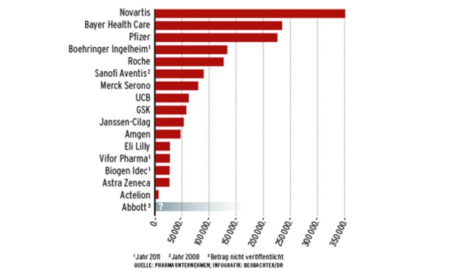 Doch das Resultat der neuen Transparenzregelung ist ernüchternd, wie eine Beobachter-Analyse von 17 Pharmakonzernen zeigt. Sieben erfüllen die grundlegenden Pflichten zur selbstauferlegten Transparenz nicht. Von Boehringer Ingelheim, Vifor und Biogen Idec sind für 2012 keine Zahlen verfügbar, die Angaben von Sanofi Aventis stammen von 2008, Abbott gibt nur eine Liste der unterstützten Organisationen bekannt, nennt aber keine Geldsummen. Astra Zeneca hat vergessen, die Zahlen von 2012 auf der Website freizuschalten, bei Actelion ist eine Fehlermeldung erschienen.