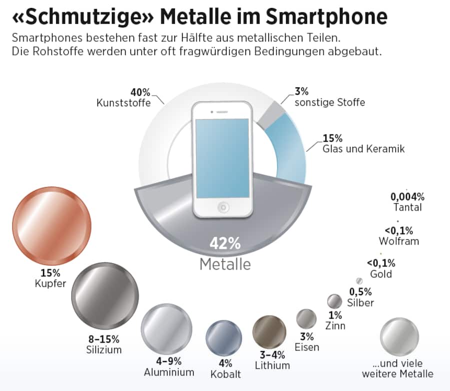 «Bis vor kurzem hiess es in manchen Branchen, es sei unmöglich, den Weg der Metalle zurückzuverfolgen», sagt Hütz-Adams. «Wenn man die Firmen per Gesetz zwingt, geht es aber doch.» Der Aufwand freilich ist riesig. So stecken in einem Smartphone etwa 1000 Einzelteile aus 40 Metallen, darunter Kupfer (rund 15 Prozent), Silizium (rund zehn), Aluminium (rund sieben) und Eisen (rund drei). Sie werden über bis zu zehn Stationen auf verschiedenen Kontinenten weiterverarbeitet. Meist versuchen die Unternehmen, von ihren Zulieferern her zurückzuverfolgen, woher die eingekauften Rohstoffe stammen.