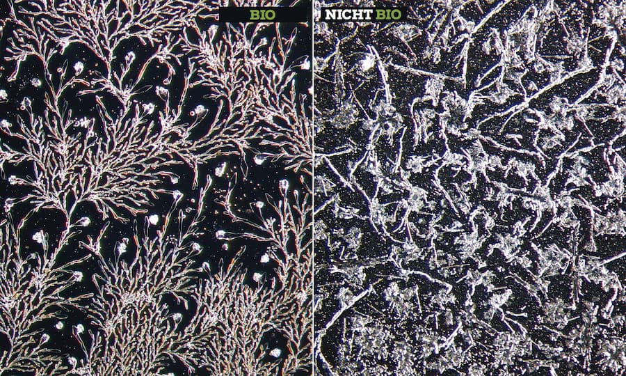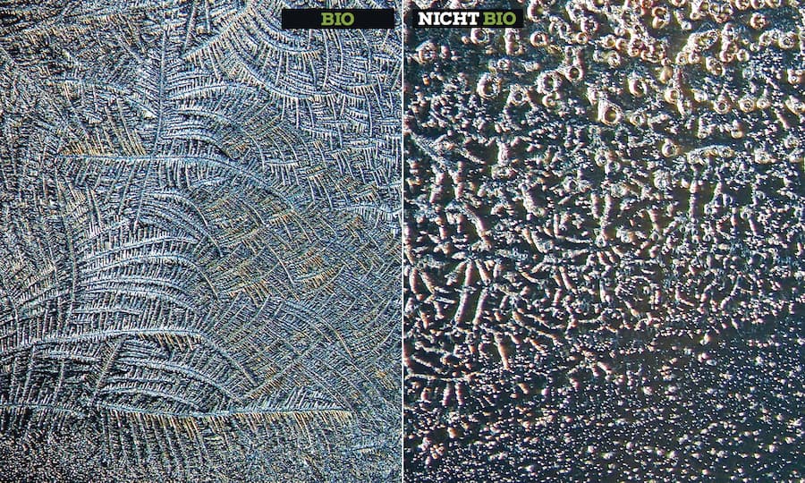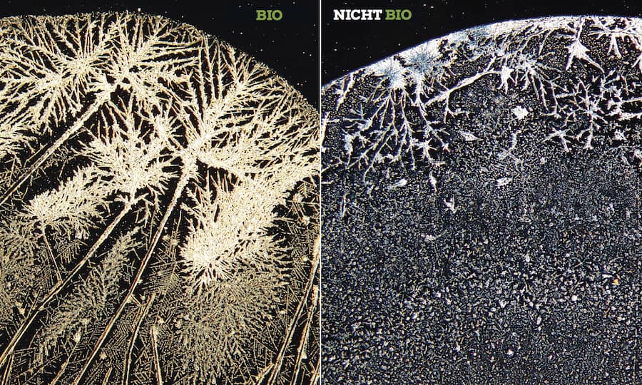 Mikroskopische Bilder zeigen Erstaunliches: Bio-Lebensmittel weisen harmonische Kristallstrukturen auf, konventionell angebaute geradezu kümmerliche. Was heisst das?