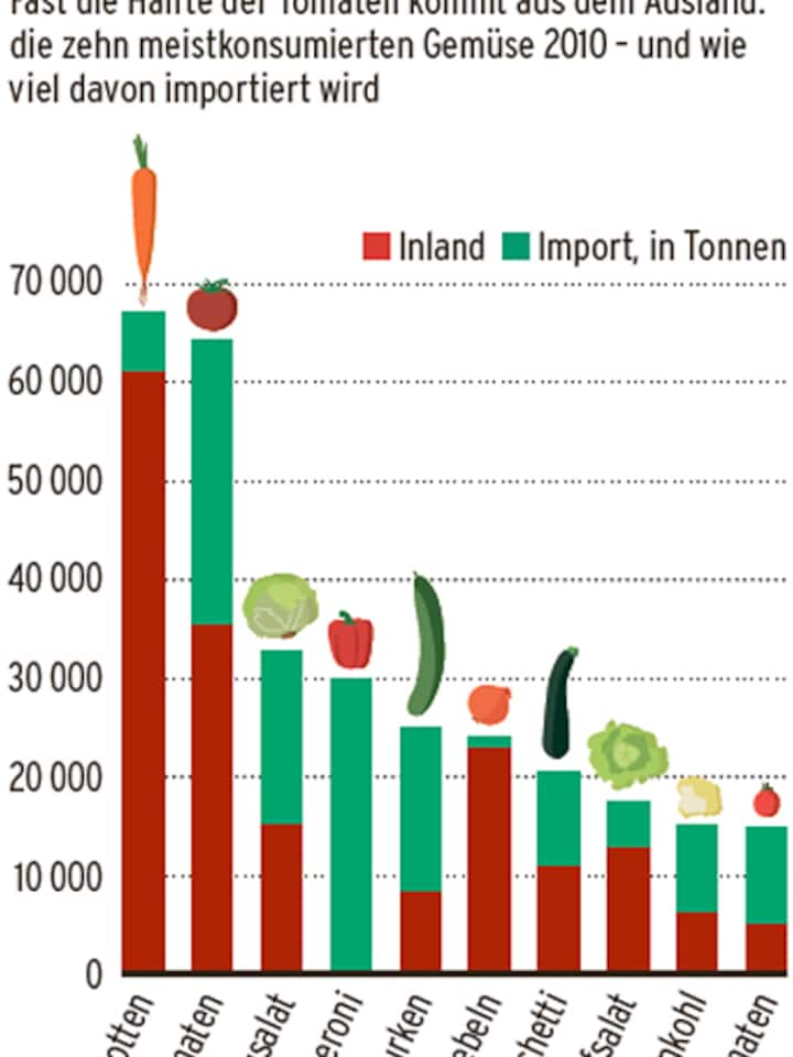 Insgesamt werden pro Jahr rund 390'000 Tonnen Gemüse in der Schweiz produziert. Hinzu kommen rund 300'000 Tonnen aus dem Ausland – im Wert von 560 Millionen Franken. Drei Viertel der Ware stammen aus der EU. Bei Früchten ist das Verhältnis von Import und Eigenanbau umgekehrt: 60 Prozent kommen aus dem Ausland, 40 aus dem Inland, wobei die Zahlen saisonal stark schwanken. Im Winter ist der Importanteil höher, vor allem wegen Gütern aus den Tropen.