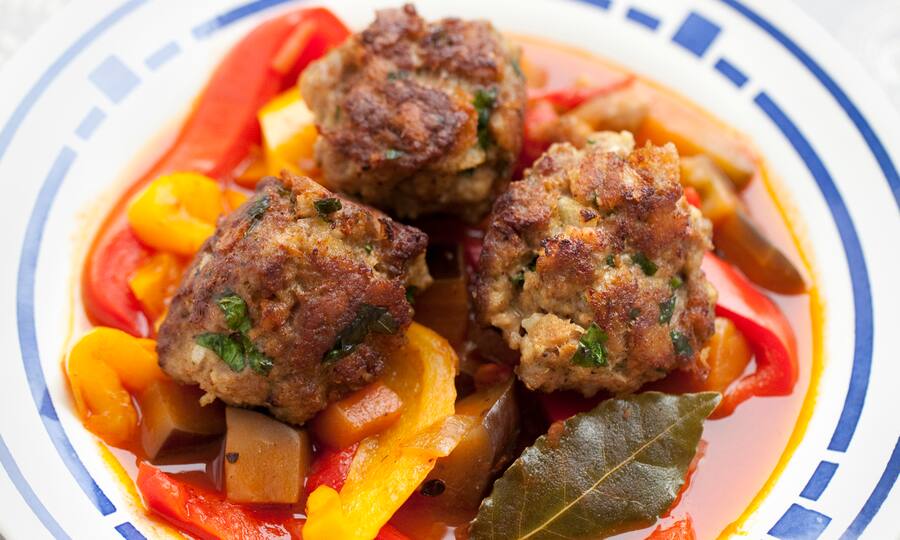 2. Aus der Fleischmasse kleine Kugeln formen und diese in Olivenöl bei kleiner bis mittlerer Hitze auf allen Seiten braten, bis sie eine schöne Farbe angenommen haben.
