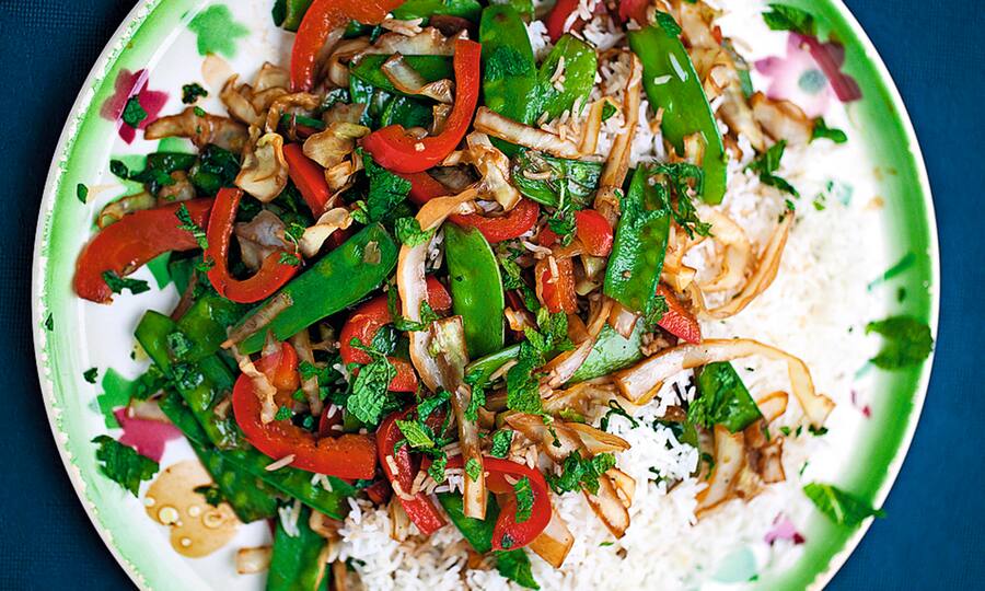 3. Den Reis in die Pfanne geben und alles erwärmen. Mit gehackter Pfefferminze bestreuen und servieren.