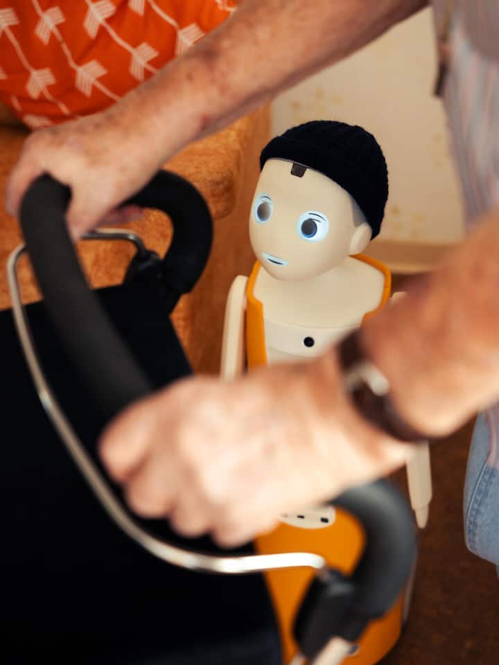 KI-Roboter Noah spricht mit Heimbewohner Egon.