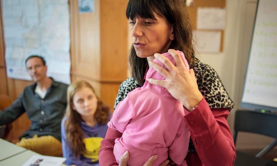 «Das Baby nörgelt, was könnt ihr tun?», fragt Orthmann. Die Kursteilnehmer wollen mit Vornamen genannt werden. «Es will ganz nah am Herzen der Mama sein», ruft Melanie. Oder ein Bäuerchen machen, sagt Orthmann. «Ein Bäuerchen ist ein Görpslein», sagt Melanie. Die 23-Jährige mit dem schelmischen Lachen ist aufgeregt, kann kaum stillsitzen. Sie will immer das erste Wort haben. Oder das letzte.