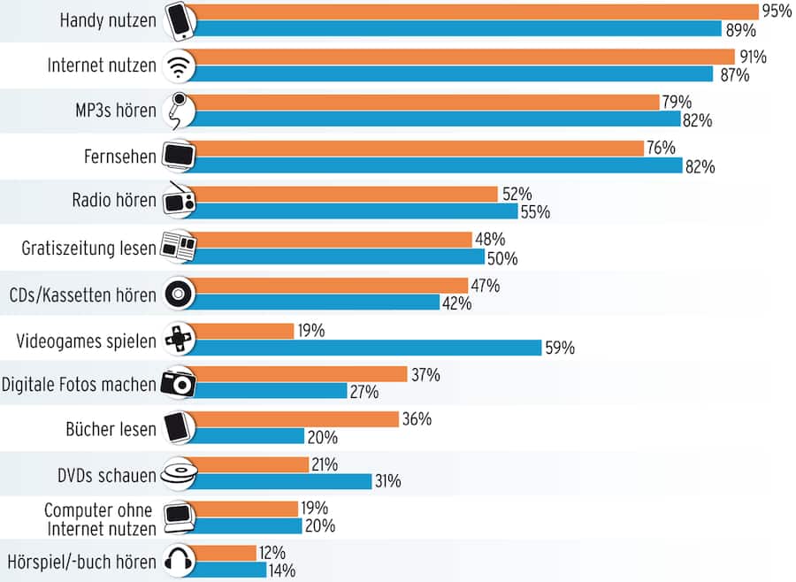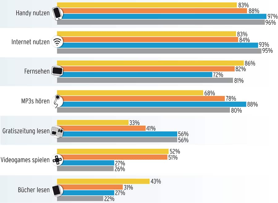 Jüngere lesen öfter Bücher als Ältere, nutzen aber Internet und Handy weniger stark.
