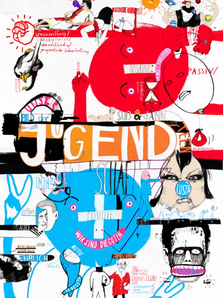 Hier sehen Sie das «Bild der Jugend», geschaffen vom Berliner Illustrator Frank Höhne. Er hat dafür Zutaten verwendet, die 18 Experten geliefert haben: Persönlichkeiten, die in ganz verschiedenen beruflichen Funktionen mit jungen Leuten zu tun haben. Der Beobachter hat sie gebeten, Stichworte zu folgenden Fragen zu liefern: