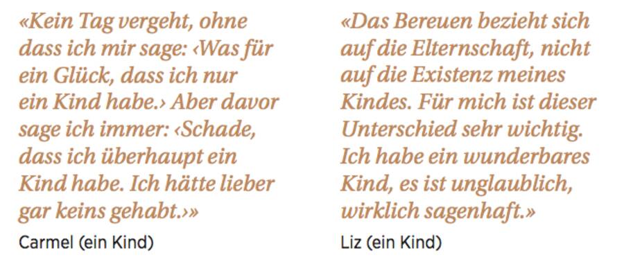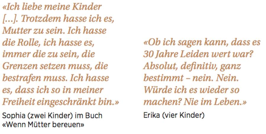 Donath: Es geht nicht um Frauen, die sich zwischendurch über ihren hektischen Alltag beschweren oder gern mal ein Wochenende für sich allein hätten. Ich habe mit Müttern gesprochen, die mit einem klaren Nein geantwortet haben auf die Frage: «Wenn Sie heute, mit Ihrem heutigen Wissen und Ihren Erfahrungen, die Zeit zurückdrehen könnten, würden Sie dann noch einmal Mutter werden?» Es geht dabei nicht darum, dass sie ihre Kinder nicht lieben, sondern um den Druck, sie lieben zu müssen. Diese Frauen empfinden eine tiefe Reue und bezeichnen die Mutterschaft als Fehler.
