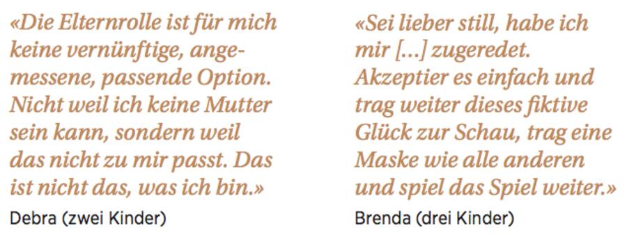 Donath: Wenn eine Frau keine Kinder möchte, wird sie irgendwann zu hören bekommen, dass sie diesen Entscheid ganz bestimmt irgendwann bereuen wird. Diese Reue wird wie eine Waffe eingesetzt. Hinzu kommt, dass Frauen, die keine Kinder wollen, häufig wie Unmündige behandelt werden.
