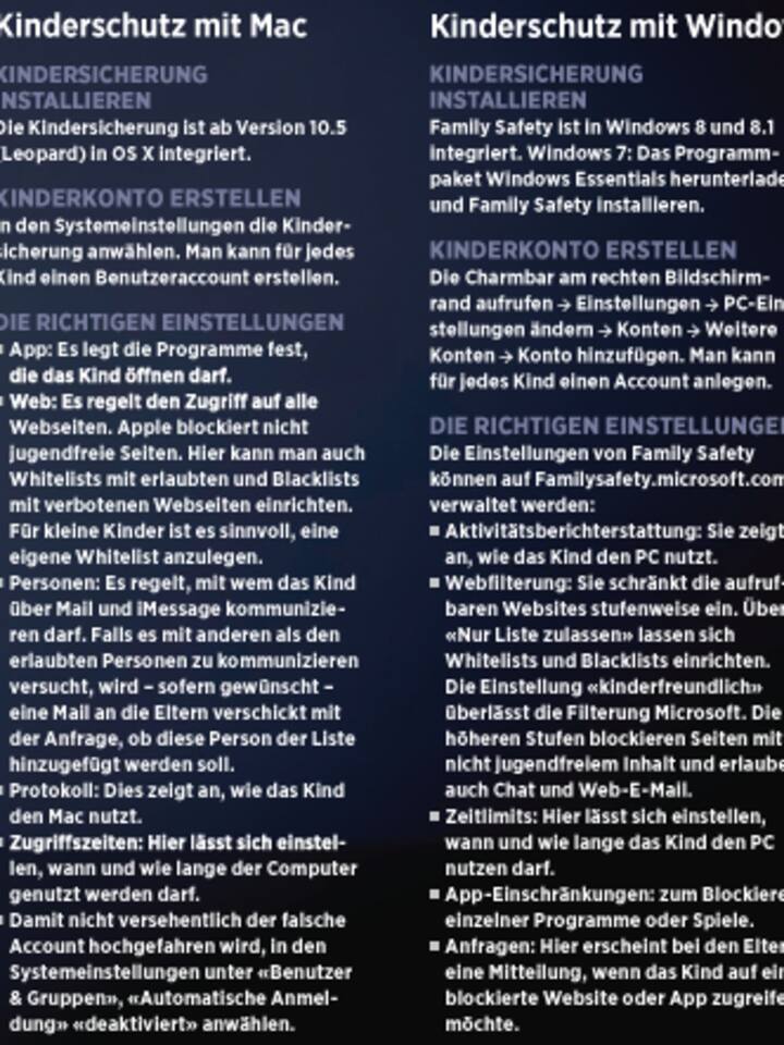 Die von Windows und Apple eingebauten Kindersicherungen funktionieren recht gut. Für kleinere Kinder kann man hier eine «Whitelist» mit Webseiten anlegen, die aufgerufen werden dürfen. Für grössere Kinder prüfen diese Filter automatisch, ob die aufgerufene Webseite für Jugendliche geeignet ist.