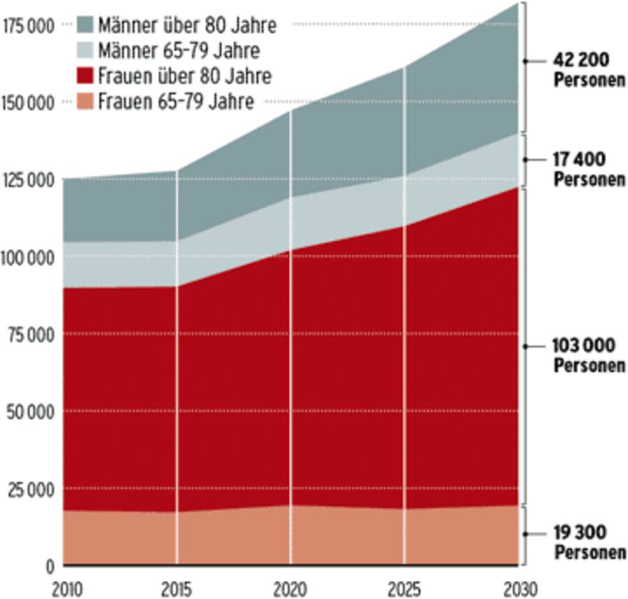 Allein gelassen, aber alles andere als allein: Laut dem Schweizerischen Gesundheitsobservatorium gibt es in der Schweiz rund 125'000 pflegebedürftige Personen im Alter von über 65 Jahren. Gut die Hälfte davon ist stationär in einem Heim, der Rest zu Hause – und hinter den allermeisten dieser Fälle stehen Angehörige, die in irgendeiner Form Pflege- und sonstige Betreuungsaufgaben übernehmen. Bis ins Jahr 2030 dürfte die Anzahl der Pflegebedürftigen auf über 180'000 anwachsen (siehe nachfolgende Grafik). Parallel dazu steigen die Kosten für die Langzeitpflege im selben Zeitraum von heute rund sieben auf jährlich 14,9 Milliarden Franken. Darin eingerechnet sind nur die Aufwendungen von Heimen und Spitex-Diensten, nicht aber die Leistungen der pflegenden Angehörigen – diese sind im eigentlichen Wortsinn unschätzbar.