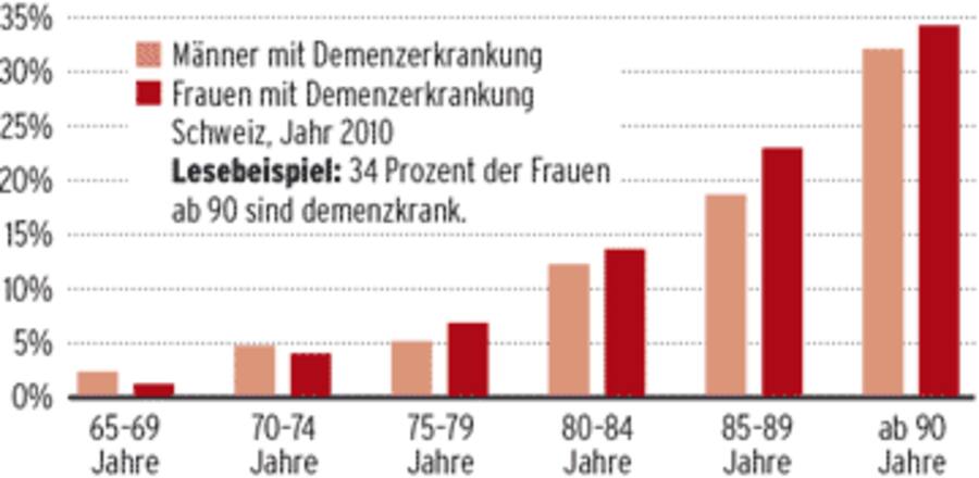 66% der Demenzkranken sind Frauen. Im Jahr 2010 waren es rund 69'000. Grund: Es gibt mehr ältere Frauen als Männer, da Frauen länger leben.