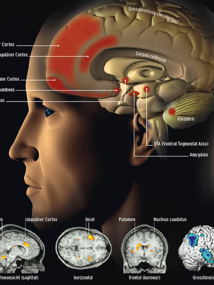 Sehen Verliebte Bilder ihrer Partner, werden eng begrenzte Areale im Hirn aktiv (gelb-orange) oder inaktiv (blau). In der Seitenansicht sieht man den cingulären Cortex, der bei Emotionen wichtig ist, sowie einen Kleinhirnbereich. Erotische Anziehung lenken Nucleus caudatus und das Putamen – im Frontalschnitt sind sie erkennbar. Im Horizontalschnitt erscheint die sogenannte Insel, sie ist wichtig für Reizempfindung. Inaktiviert sind Grosshirnareale, wo rationales Denken stattfindet.