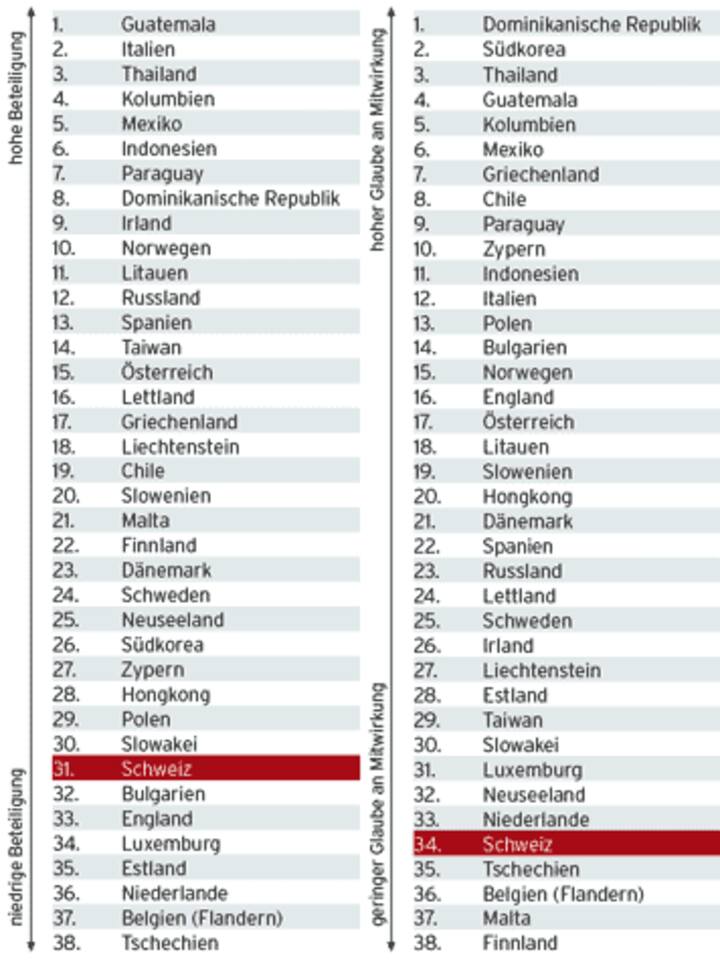 Dasselbe Bild zeigt sich bei der Frage, ob man durch eigenes Engagement in politischen und gesellschaftlichen Angelegenheiten etwas bewirken kann. Da fehlt den Jugendlichen ausgerechnet in der direkten Demokratie Schweiz der Glaube – fünftletzter Platz. Zudem hat jeder vierte Schüler nur ungenügendes politisches Wissen.
