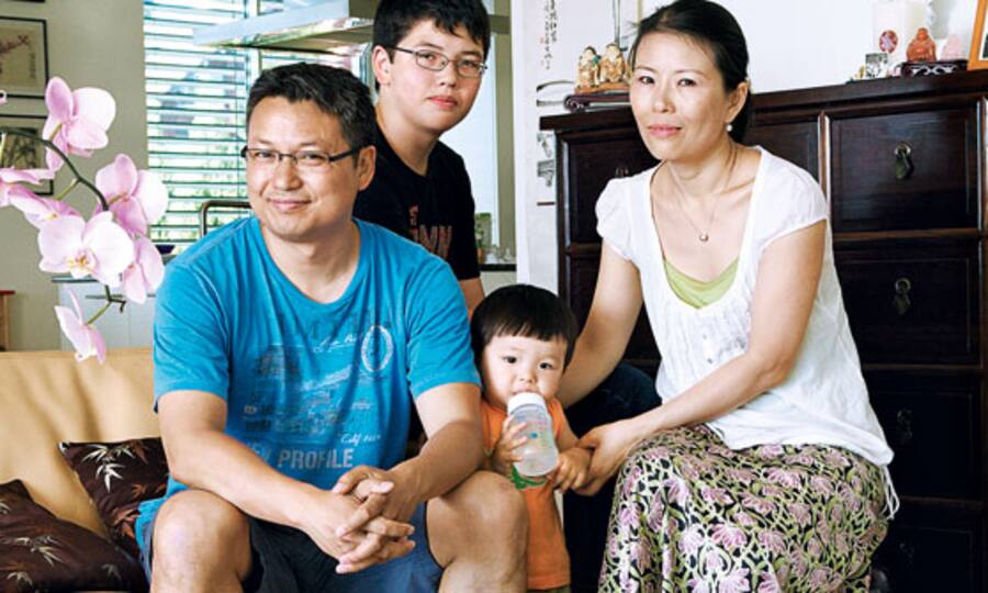 Laukuan Soliva Wan, China, 43, Seidenladenbesitzerin, seit 17 Jahren in der Schweiz, mit Marco Soliva, 40, Informatiker, Yin Jie, 14, und Kim, 18 Monate