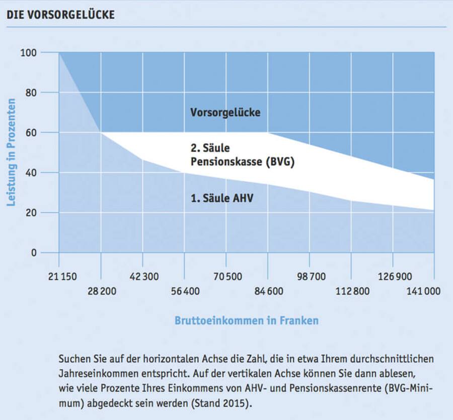 Die Leistungen der 1. und 2. Säule erlauben den meisten nur begrenzt, den gewohnten Lebensstil über die Pensionierung hinaus aufrechtzuerhalten. Erfahrungswerte zeigen, dass im Pensionsalter rund 70 bis 80 Prozent des zuletzt erzielten Erwerbseinkommens für die Fortführung des bisherigen Lebensstandards benötigt werden. Erreichen die voraussichtliche AHV- und Pensionskassenrente zusammen diese Grössenordnung nicht, ist Sparen im Rahmen der 3. Säule angezeigt.