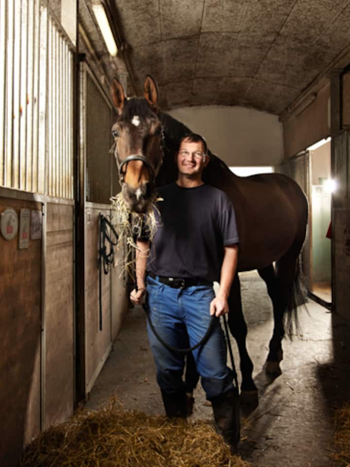 Er steht an zwei Tagen um sechs Uhr früh im Pferdestall. Dort führt er die Tiere erst raus, dann mistet er die Boxen. Danach hilft er, die Kühe ins Freie zu lassen, füttert das drei Tage alte Kälbchen mit temperierter Milch und wünscht den Pferden «en Guete». Er räumt die Scheune auf, rammt Zaunpflöcke in den Boden und krault den Berner Sennenhund Nero am Hals.