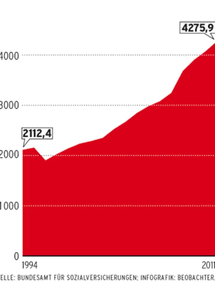 Dorothea Amsler hat ihre Kosten im Griff. Bei den staatlichen Ergänzungsleistungen zu AHV und IV ist das anders. Hier zeichnet sich ein finanzielles Fiasko ab. Mit fast 4,3 Milliarden Franken haben Bund und Kantone im Jahr 2011 etwa 288'000 AHV- und IV-Bezüger unterstützt, deren Renten die Lebenskosten nicht decken. Das ist eine Steigerung um 3,8 Prozent gegenüber dem Vorjahr und über eine Milliarde mehr als noch 2007. Für 2012 rechnet das Bundesamt für Sozialversicherungen (BSV) mit Ausgaben von rund 4,5 Milliarden Franken – nochmals eine Steigerung um über vier Prozent.